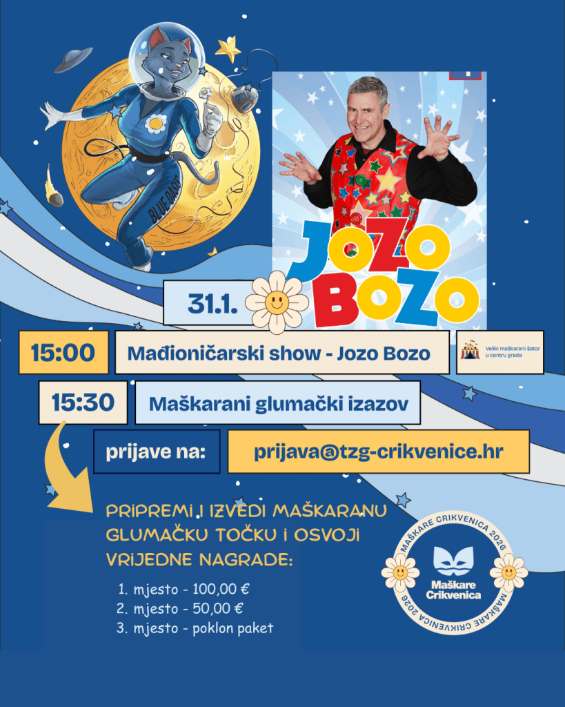 Iako je najvažniji dan Maškara u Crikvenici iza nas, ne zaboravite da imate priliku uživati u preostalim događanjima, a ovaj nas tjedan prvo očekuje maškarani pikado turnir u petak, 30. siječnja. Dan poslije, 31. siječnja, naši najmlađi imaju priliku uživati u mađioničarskom showu s Jozom Bozom i u glumačkom izazovu. Večer nam donosi nastup uvijek raspoloženog Jole i grupe Allegro. Nastavljamo u nedjelju, 1. veljače, u malo mirnijem, ali i dalje maškaranom tonu – čeka nas čajanka i tombola te animacija za djecu u šatoru na trgu.