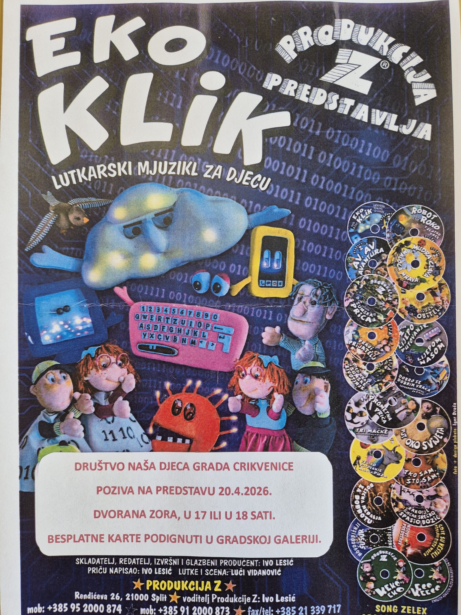 Društvo Naša djeca Grada Crikvenice povodom Dana planeta Zemlje poziva djecu i roditelje u Dvoranu Zora, Vinodolska ulica 1, Crikvenica na lutkarski mjuzikl za djecu „Eko klik“ 20. 4. 2026. (ponedjeljak). Prva izvedba bit će u 17 sati, a druga izvedba bit će u 18 sati. Besplatne karte mogu se preuzeti u Gradskoj galeriji, Strossmayerovo šetalište 22, Crikvenica.