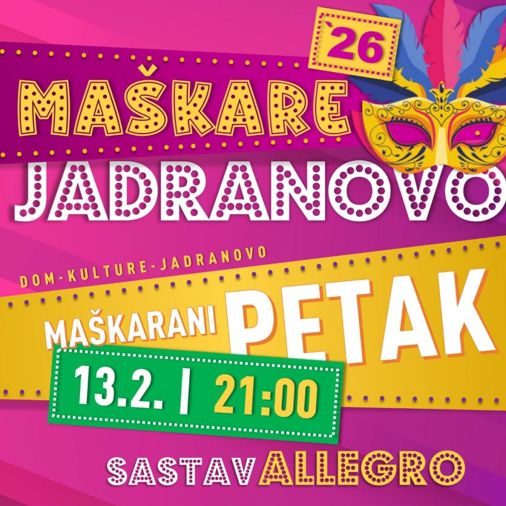 Jakovarske krabulje nam spremaju Jakovarski maškarani petak 13. veljače od 21:00 sat u Domu kulture u svome mjestu. Nastupa glazbeni sastav Allegro.