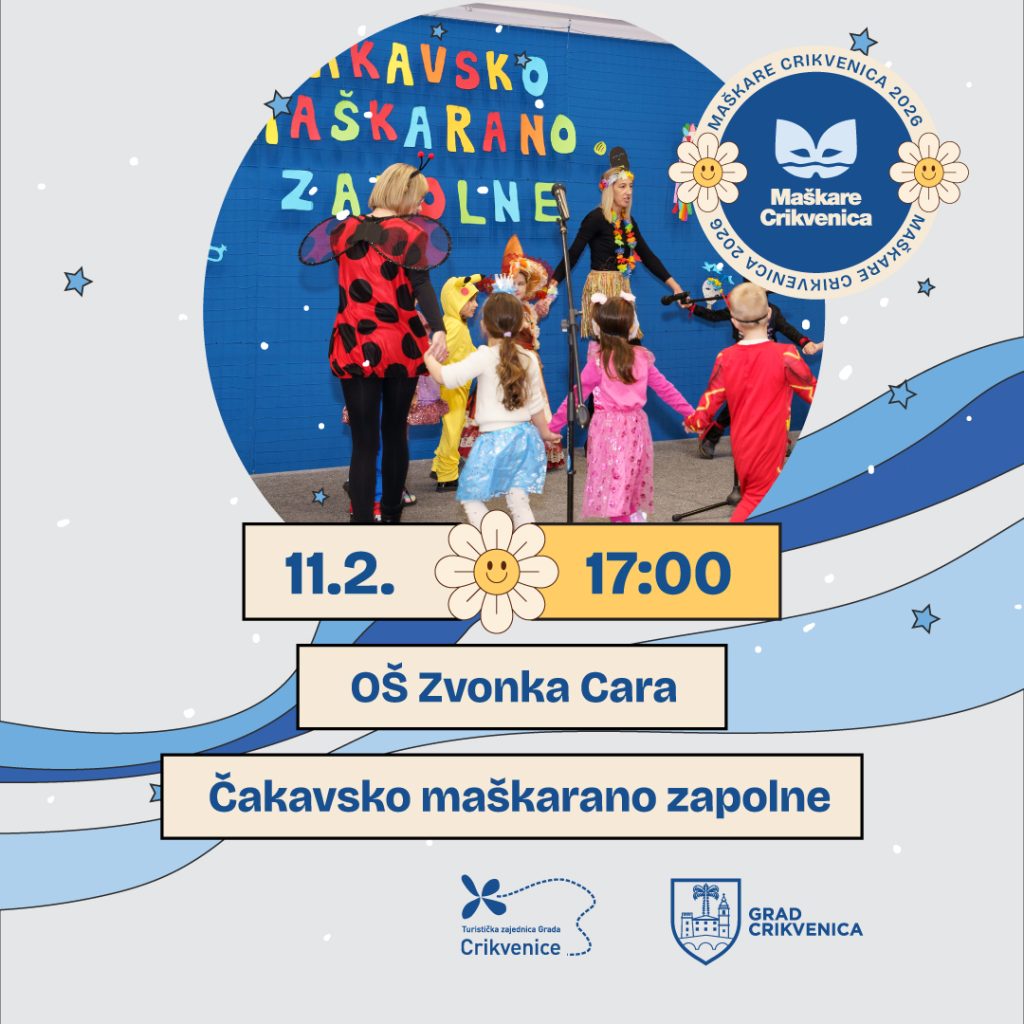 U srijedu, 11. veljače, održat će se Čakavsko maškarano zapolne u Osnovnoj školi Zvonka Cara u Crikvenici s početkom u 17:00 sati, koje donosi autentičan spoj čakavske riječi, tradicije i veselja. Ovaj je dječji program zamišljen kao opušteno druženje uz njegovanje lokalne kulturne baštine i maškaranih običaja ovoga kraja.