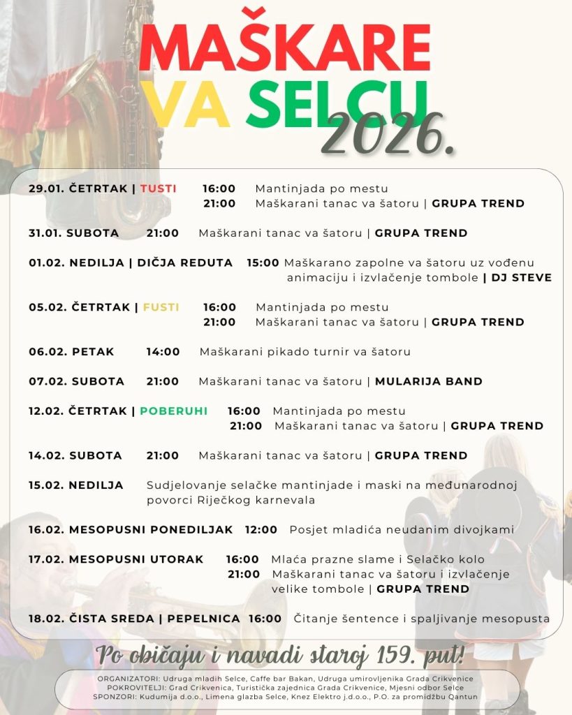 U četrtak, 12. veljače, u Selcu nam poberuhi donose mantinjadu po mestu od 16:00 sati, a od 21:00 sat maškarani tanac va šatoru uz glazbeni sastav Trend, koji nastupa i za Valentinovo na istom mjestu, u isto vrijeme.