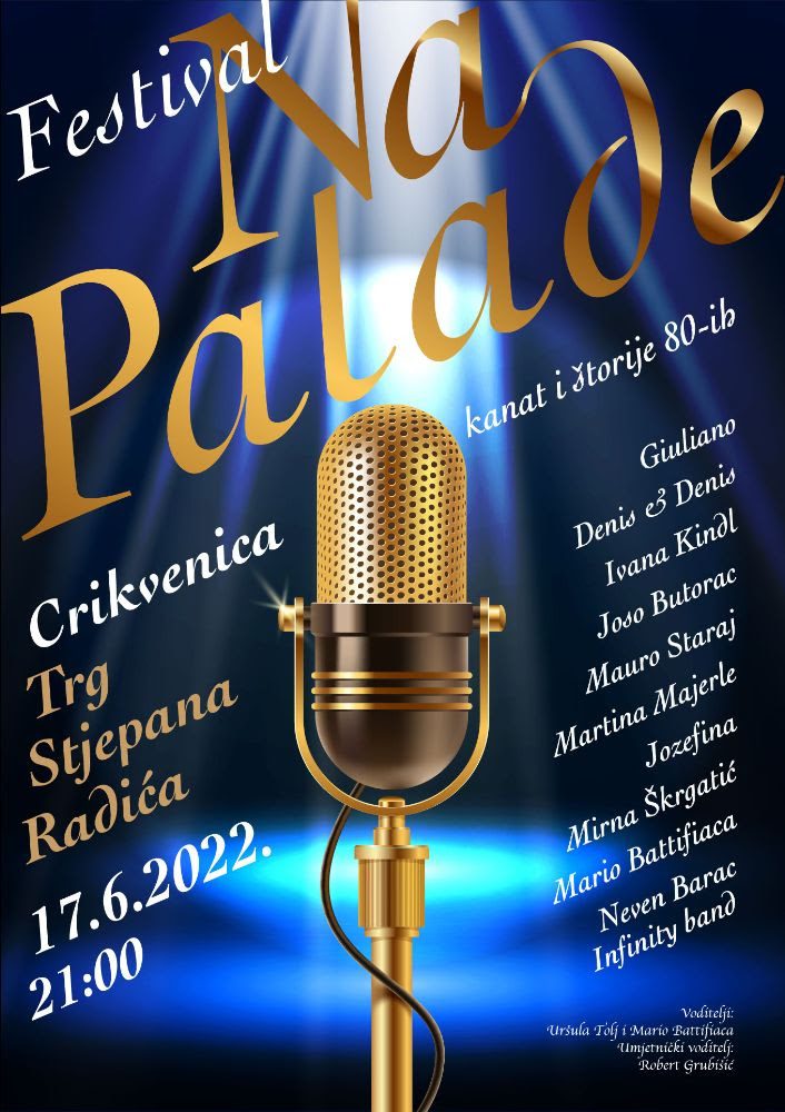 „Nakon kratke stanke „Na palade“ kreće dalje punim jedrima. Veseli me što smo za ovo izdanje festivala odabrali pjesme jednoga od najplodonosnijih perioda glazbe, stoga će posjetitelji uživati u najpoznatijim domaćim i stranim hitovima osamdesetih godina. Za dobro raspoloženje na glavnom crikveničkom trgu pobrinut će se vrhunski interpreti poput Ivane Kindl, Giuliana, dua Denis&Denis, Marija Battifiace, Martine Majerle, Jozefine, Jose Butorca, Mirne Škrgatić, Maura Staraja te gosta iznenađenja. Sve goste će pratiti Infinity band, a poseban značaj festivalu će donijeti voditeljski dvojac – Uršula Tolj i Mario Battifiaca.“