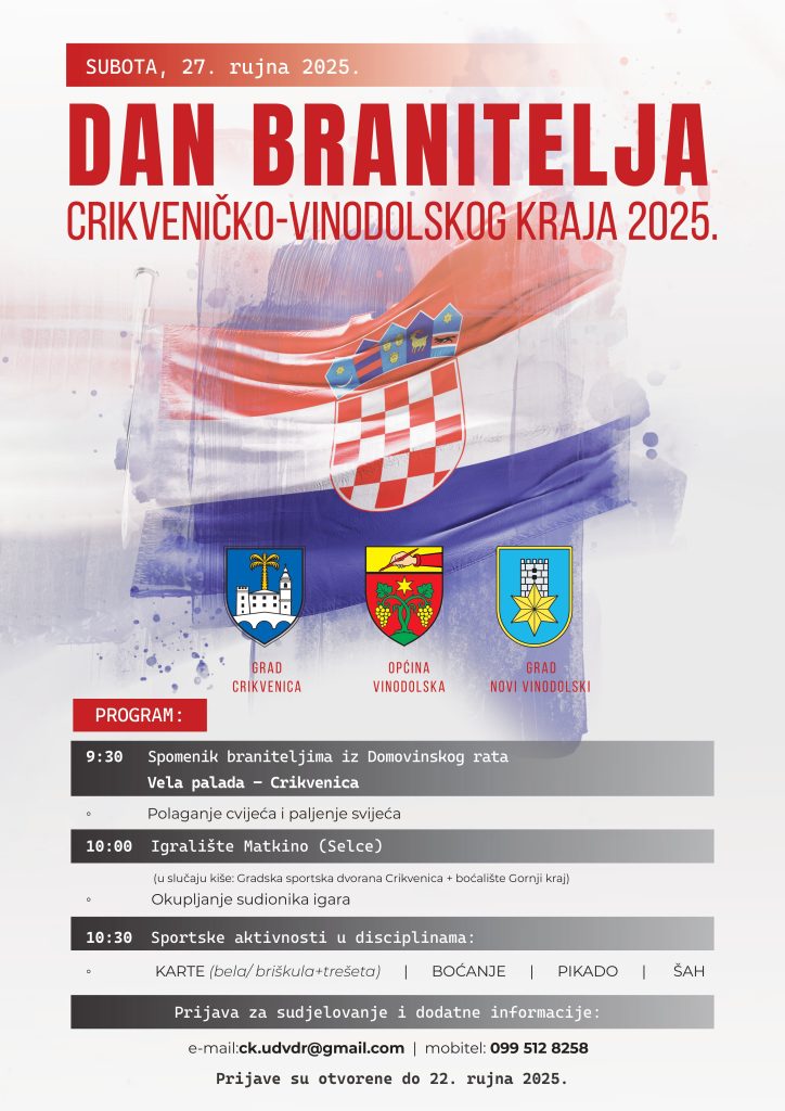 Pozivamo sve hrvatske branitelje s područja Crikvenice, Novog Vinodolskog i Vinodolske općine da se pridruže zajedničkom obilježavanju, druženju i prisjećanju na hrabrost i zajedništvo koje nas je povezalo u najtežim trenucima naše povijesti.