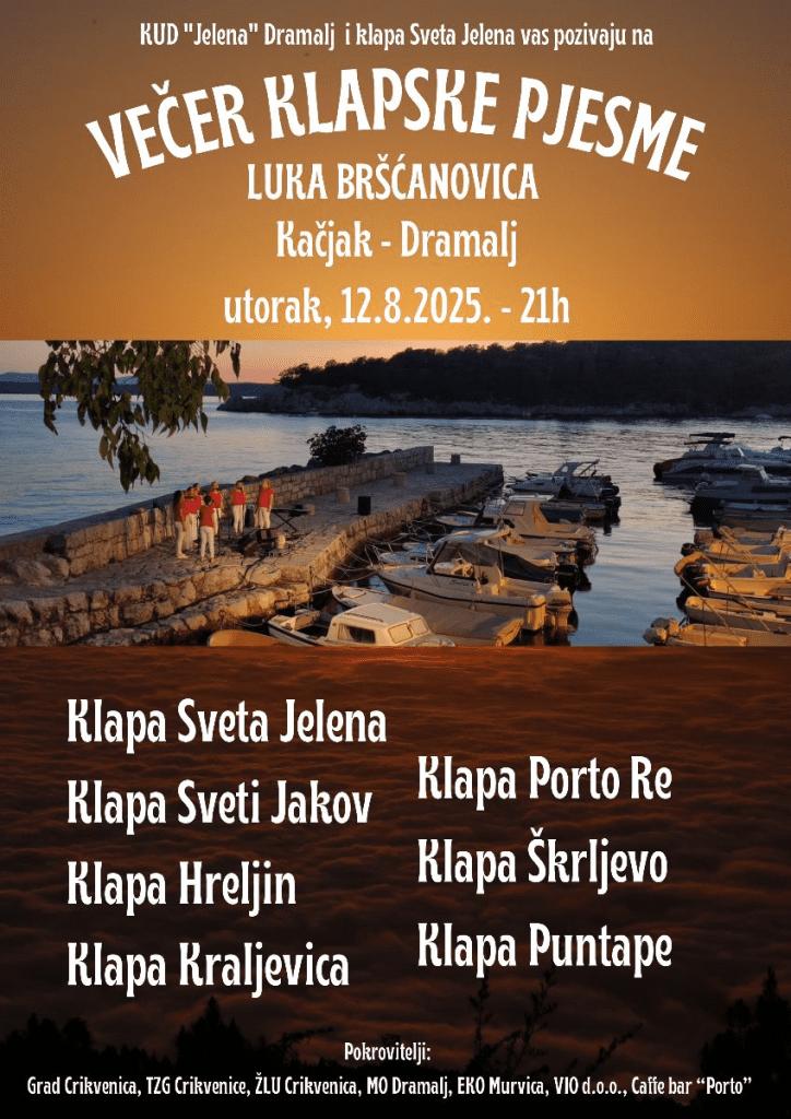 Budite i vi dio predivne atmosfere u Dramlju na „Večeri klapske pjesme“. Nastupaju klape „Sveta Jelena“, „Sveti Jakov“, „Hreljin“, „Kraljevica“, „Porto Re“, „Škrljevo“ i „Puntape“.
