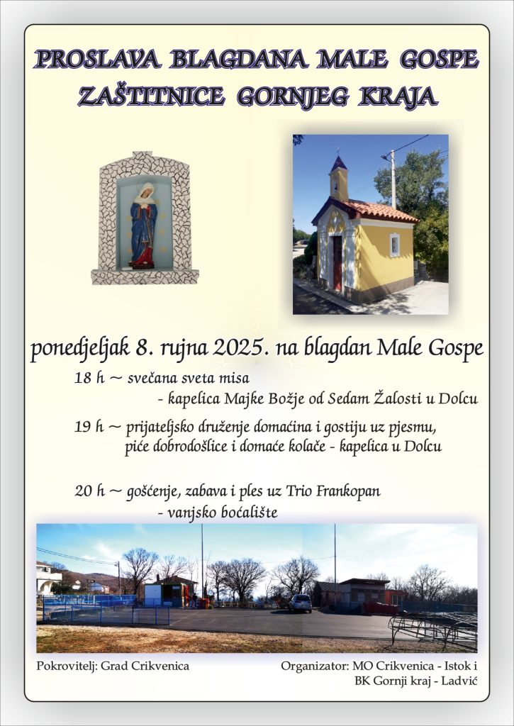 Svim Crikveničankama i Crikveničanima, a posebice dragim stanovnicima Gornjeg kraja, od srca čestitamo blagdan Male Gospe, nebeske zaštitnice Gornjeg Kraja.